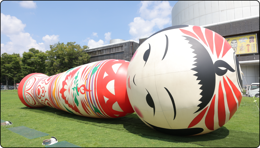 Yotta【木崎公隆、山脇弘道】の作品は、国立民族学博物館の前にある芝生広場にも展示されていました。巨大なバルーン製のネオ伝統こけし「花子」です。青々とした芝生に気持ち良さそうに横たわる「花子」のそばに近づくと「ありがとう、こんにちは」や「ようこそ、ようこそ」と呟く声が。さらに「ずいずいずっころばし」を歌ってくれるなど、愛嬌たっぷりです。親しみやすく愛らしい姿に引き寄せられるように、来場者たちも写真を撮影するなどして「花子」とのコミュニケーションを楽しんでいました。